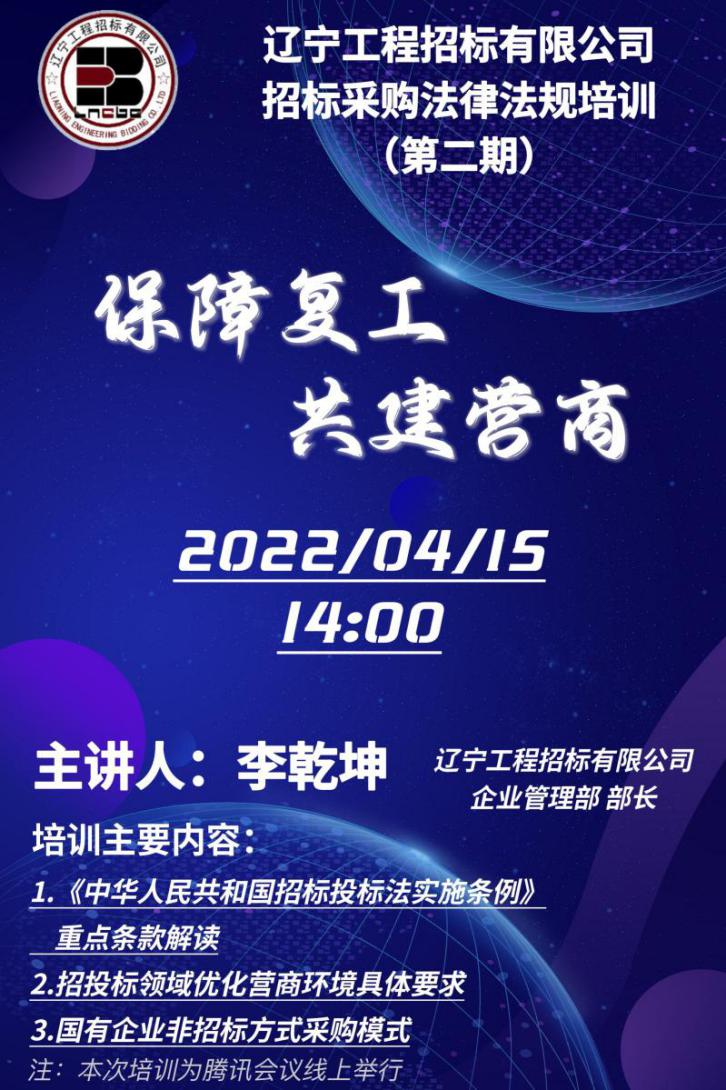 为全面贯彻中国共产党辽宁省第十三次代表大会和省纪委监委关于优化营商环境的部署,着力落实《省工程咨询集团开展营商环境监督行动工作方案》工作要求,统筹推进疫情防控与生产经营,4月15日,公司举办了第二期招标采购法律法规培训系列活动。在积极有序推进复工复产的关键时期,本次培训全过程通过线上视频会议方式进行,包括机关事业单位、央企及地方国企、金融机构、高校等近百家单位300余名代表参加培训,为保障复工复产、优化营商环境提供了有力支撑。