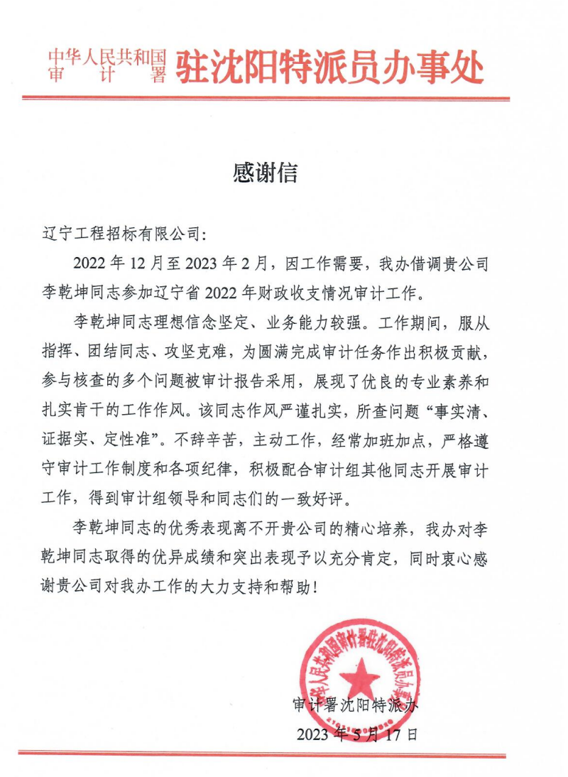 近日,公司再次收到审计署沈阳特派办的感谢信,对公司在工作中给予的帮助和支持表示感谢。